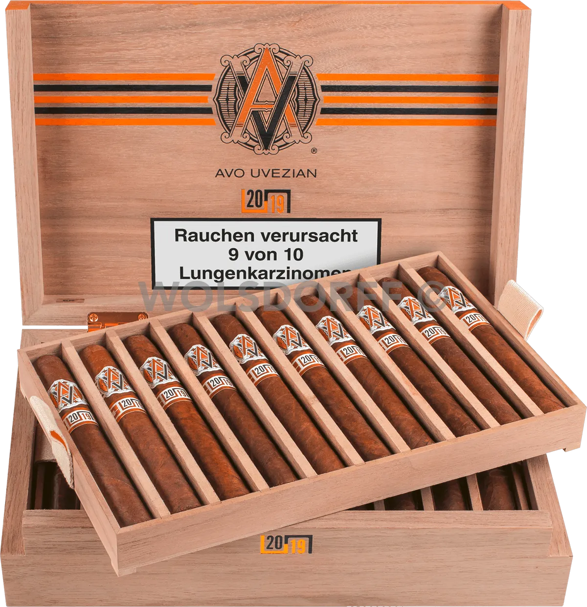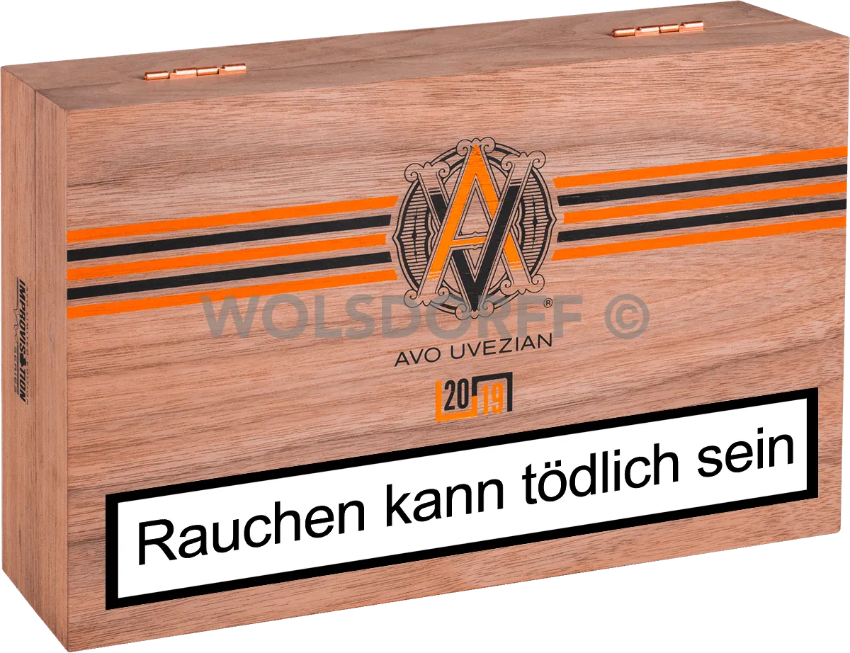 Die Verpackung der AVO Improvisation Limited Edition 2019 ist von der Wickelform (Zigarrenpresse) der Box-Pressed-Zigarren inspiriert. Sie wird verwendet, um die Zigarren während des Rollvorgangs zu formen. Das zweite Band der Zigarre ist ebenso von der Wickelform inspiriert und ziert den Jahrgang der Edition "2019", welches in das Formmuster der Zigarrenpresse eingearbeitet ist.