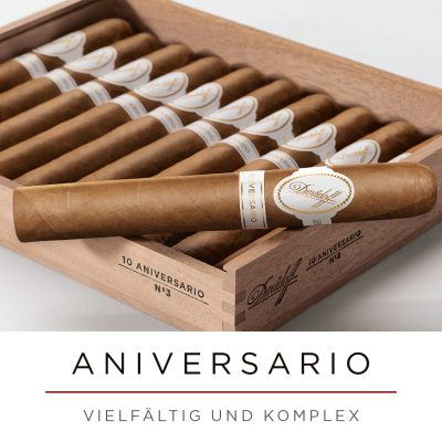 Die Aniversario-Linie wurde 1986 anlässlich des 80. Geburtstags von Zino Davidoff lanciert. Noch heute bietet sie mit mittelkräftiger Intensität und einem unwiderstehlich cremigen Finish ideale Zigarren, um besondere Zeiten schön auszufüllen.